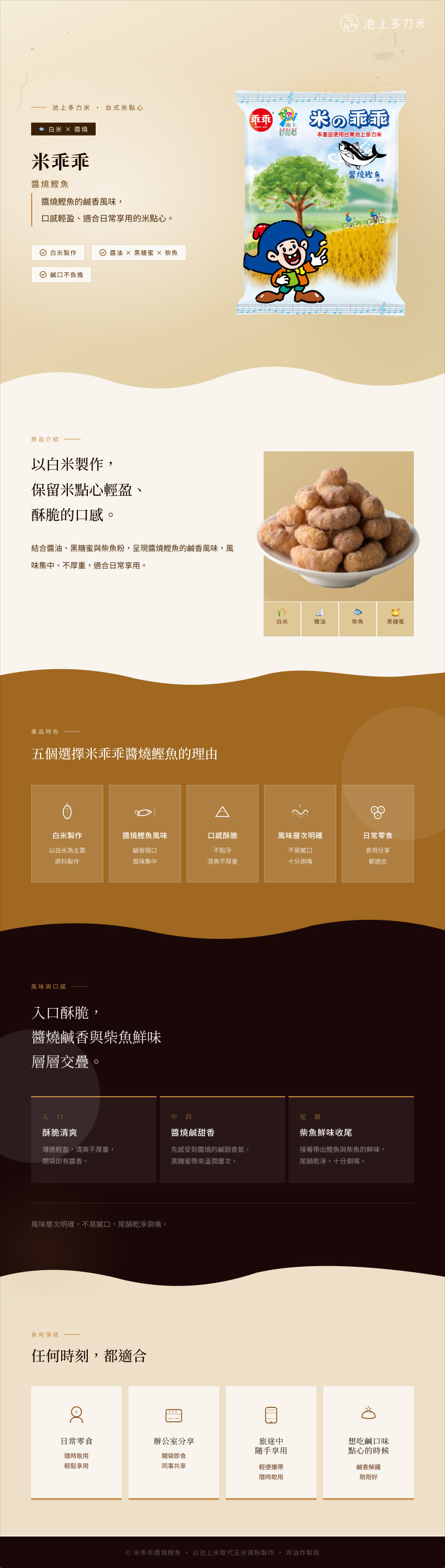 以池上米取代玉米澱粉製作的米乖乖,健康更升級。 醬燒鹹香風味帶出酥脆口感,添加米穀粉吸油少,更健康。